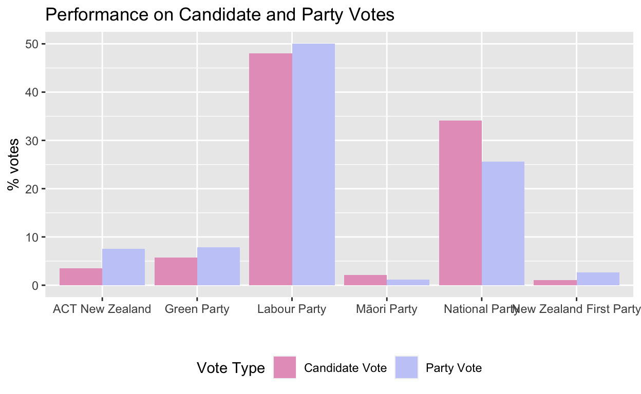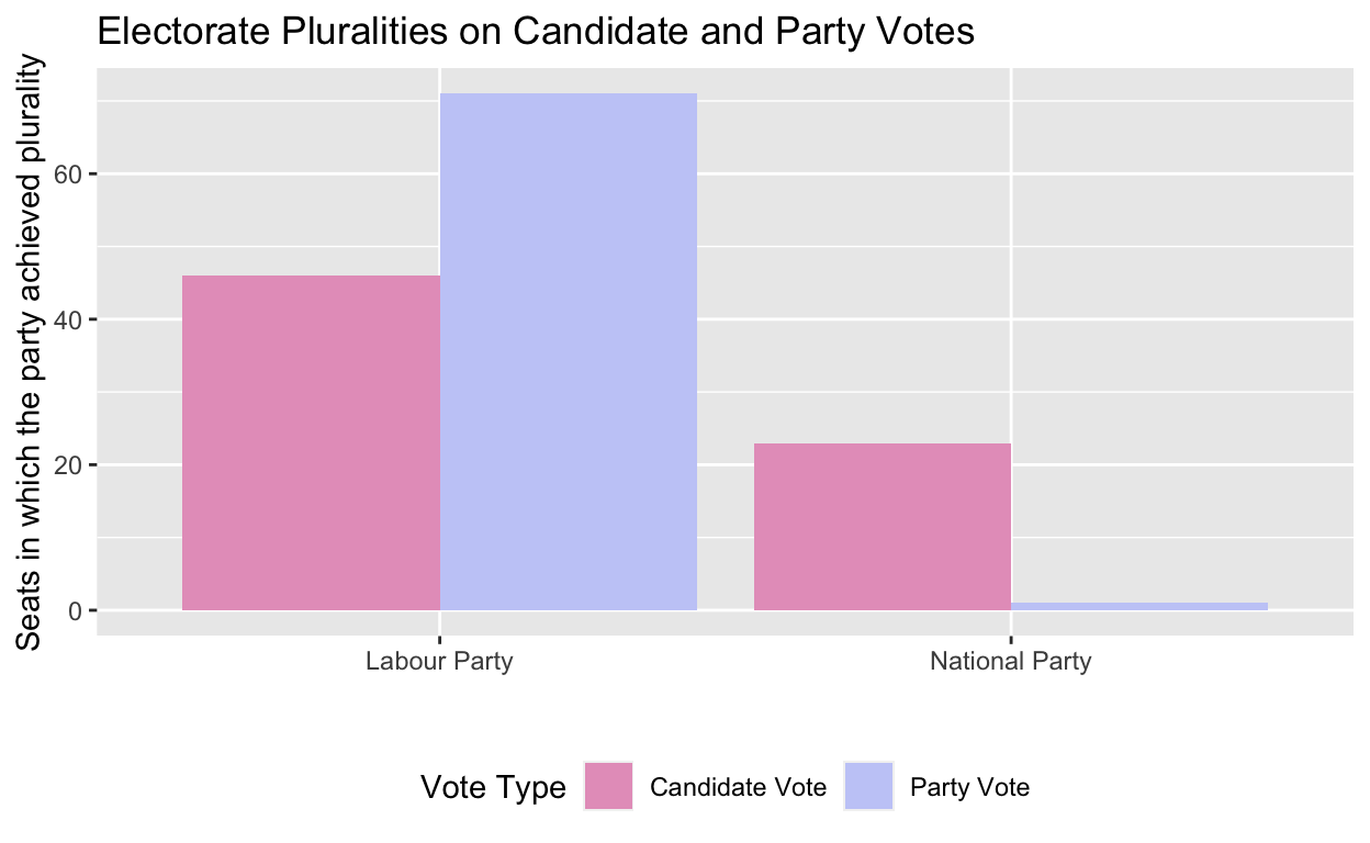 Clearly, National significantly outperformed in candidate votes compared to their party vote performance. That is mirrored in the constituency counts: National had the plurality (i.e., the most votes) of candidate votes in 26 23 electorates, but the plurality of party votes in only four one1. Why? Three possibilities occur to me (ranked in order of estimated importance):