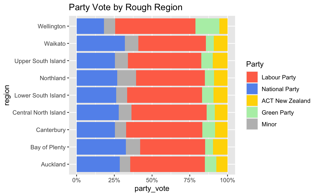 This will be a longer post sometime in the future. In that post, I’ll see what predicts support for each of the parties based on the characteristics of the constituencies. But, in the mean time, here are the party votes cast in the general electorates aggregated into some rough regions (please excuse my poor New Zealand geography, especially residents of the Central North Island – I have no reason to be bad at it. I just am.):