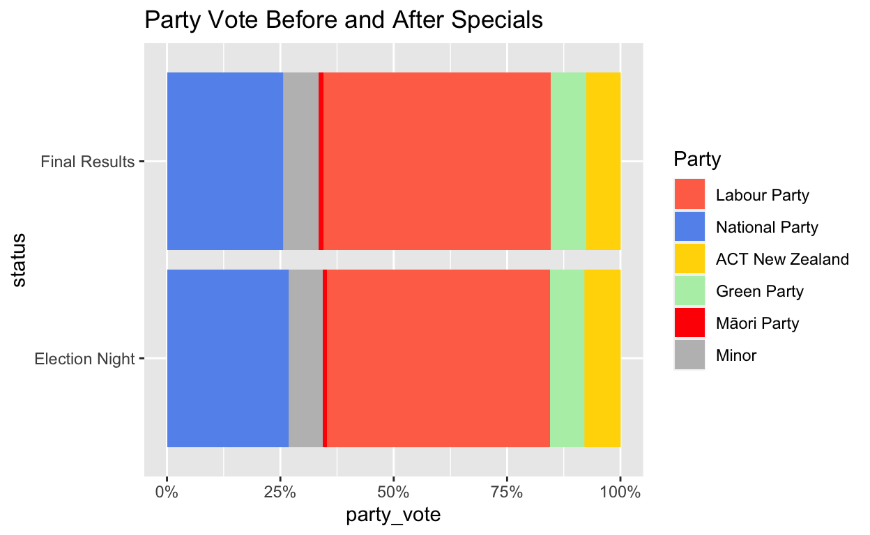 This shows the overall proportions of party votes won by each party before and after specials. It confirms what I said in the introduction: Nothing really changed with specials, except that Labour’s lead got marginally larger and the Māori Party got enough for a second seat.