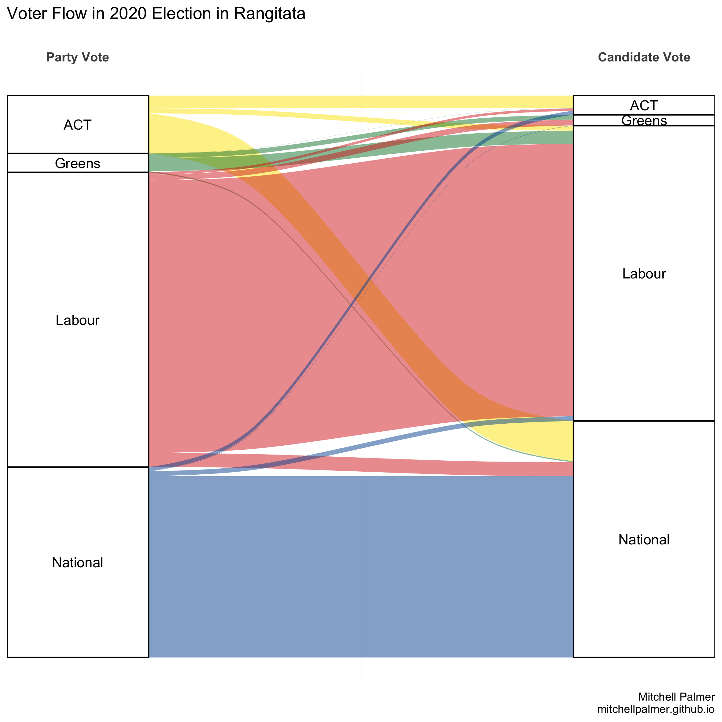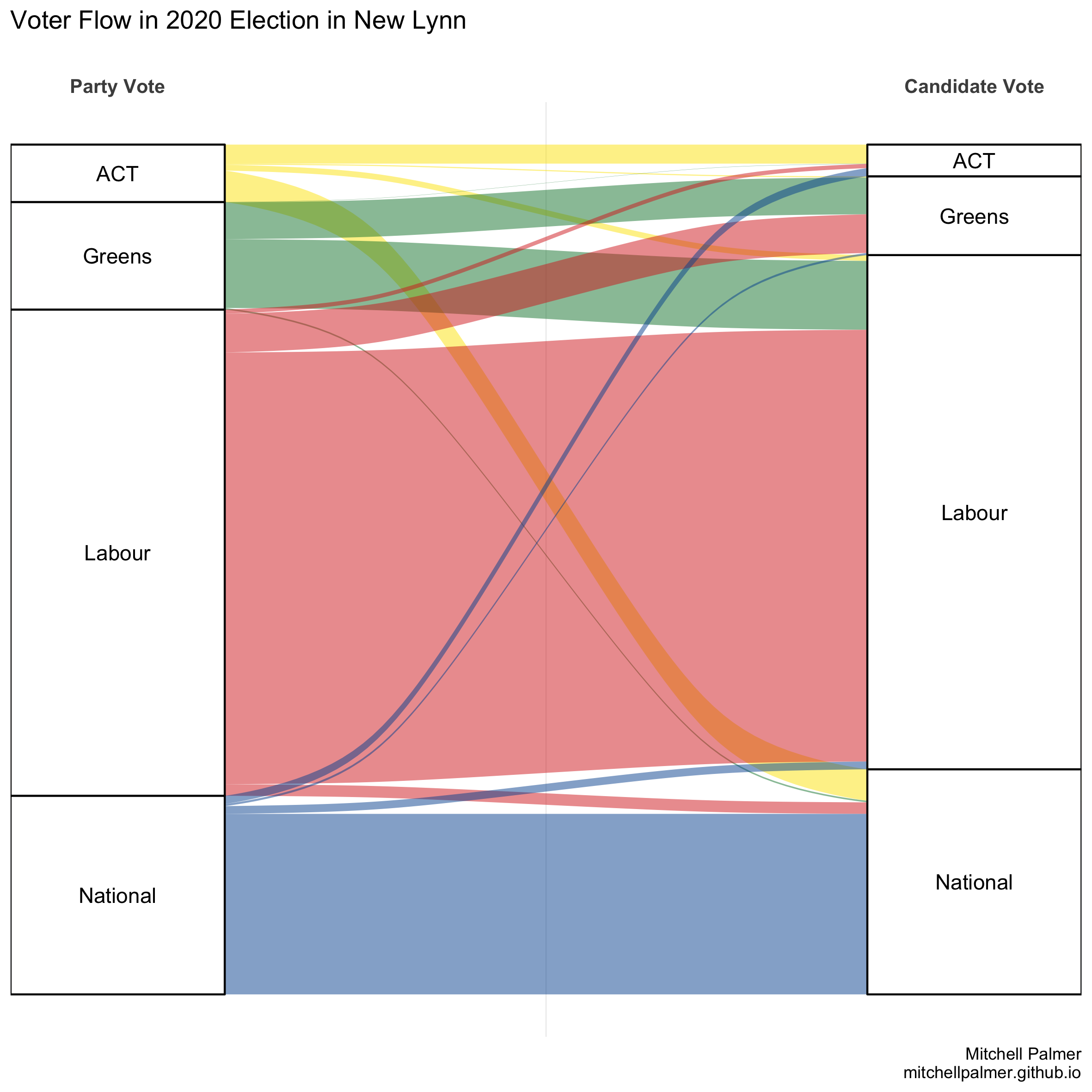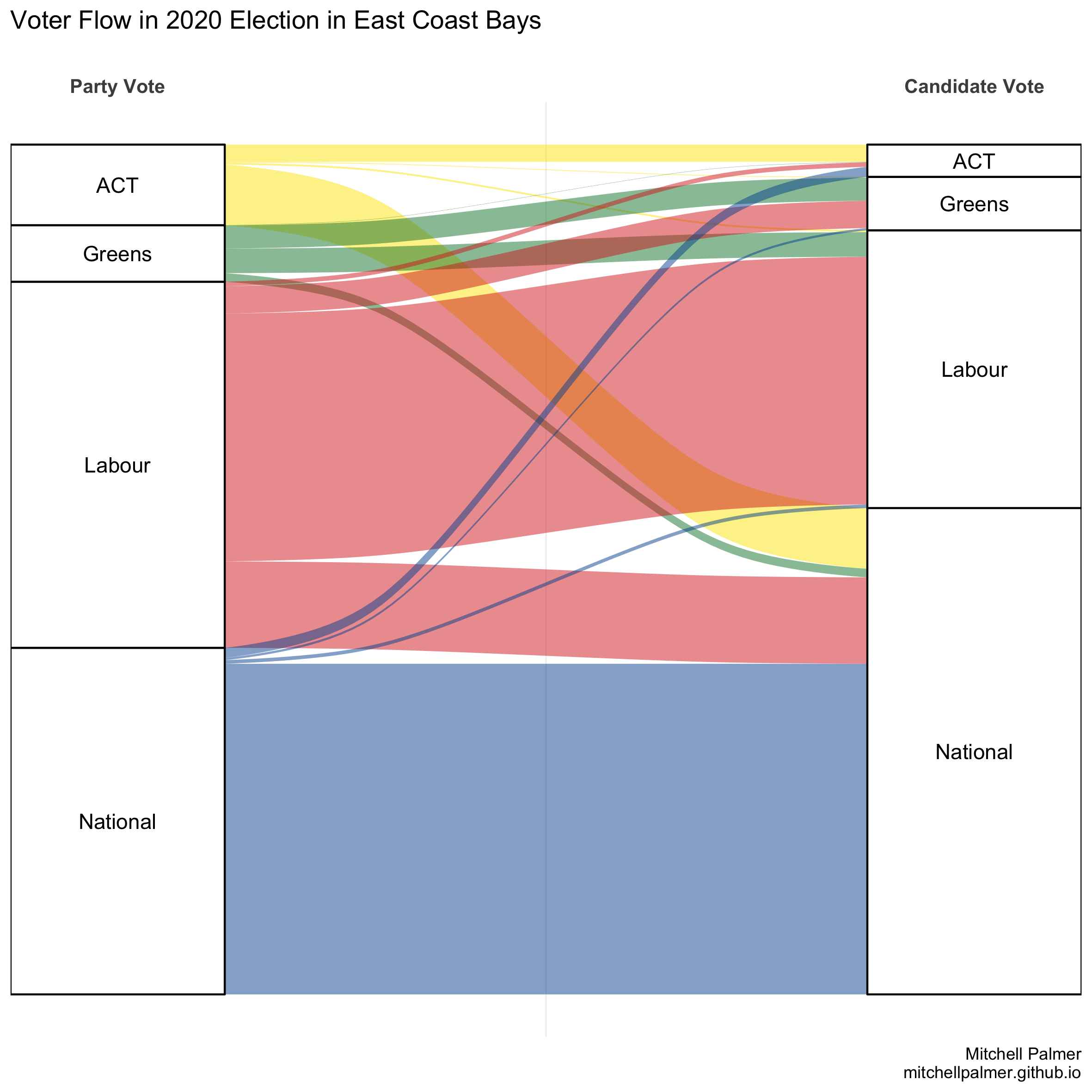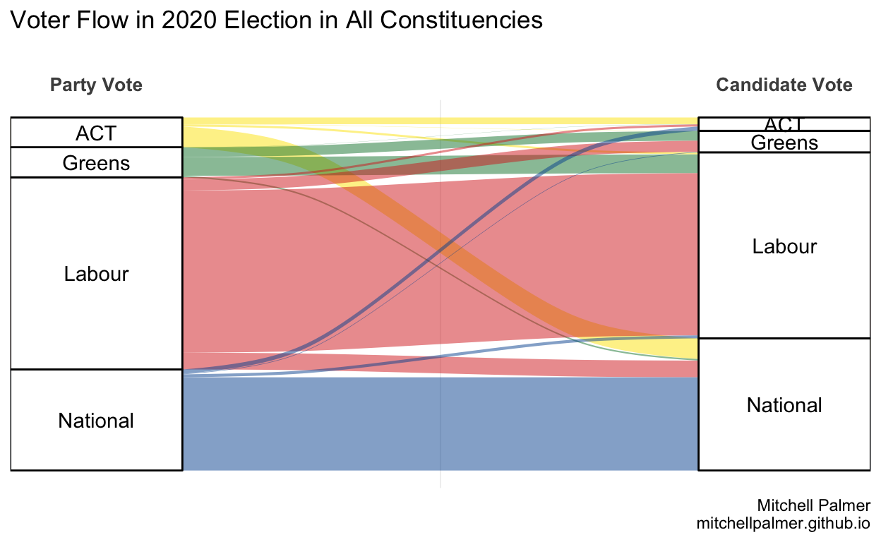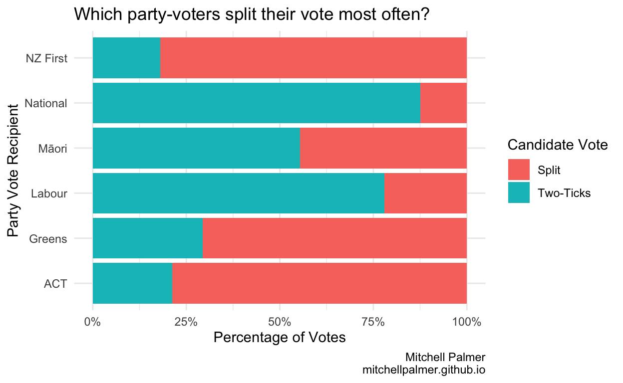 As one might expect, the people who most often split their votes are those who vote for parties which do not actively campaign for the electorate vote in most areas. Interestingly, Labour party-voters split their votes at a much higher rate than National party-voters. Let see where the split-voters from the parties choose to reallocate their votes.