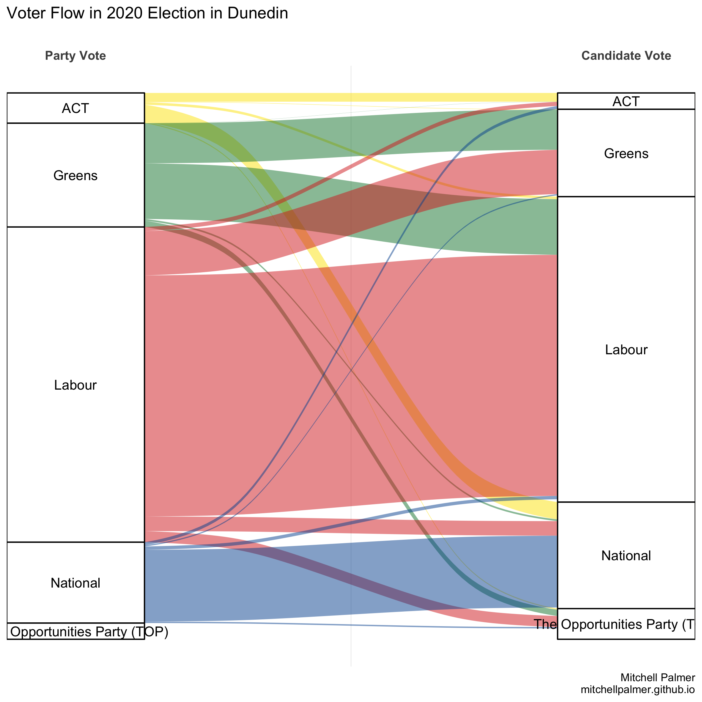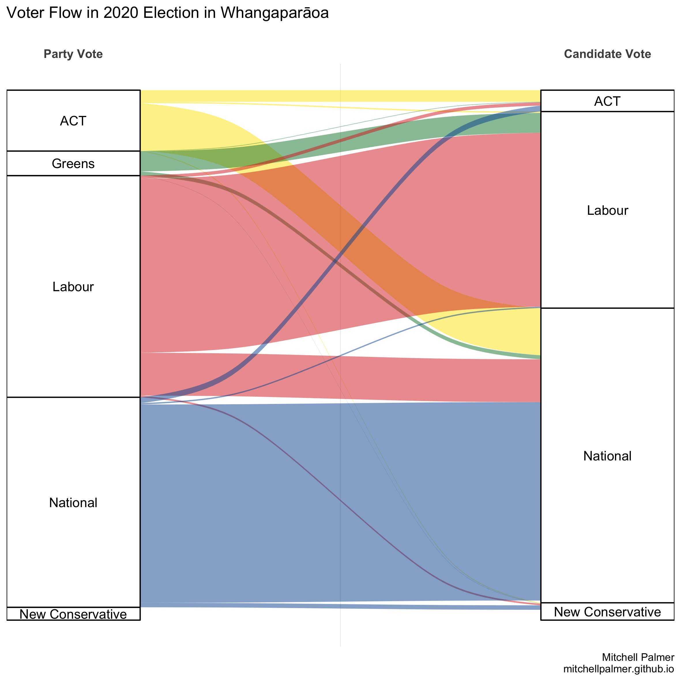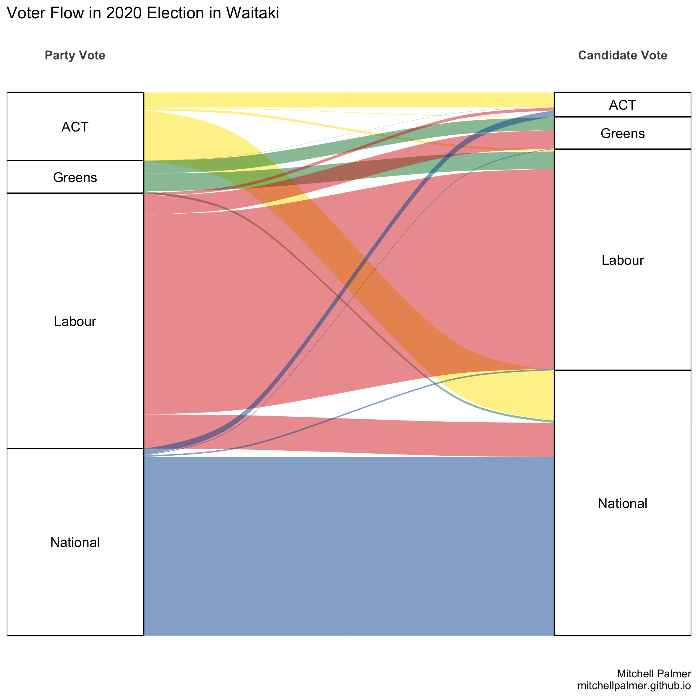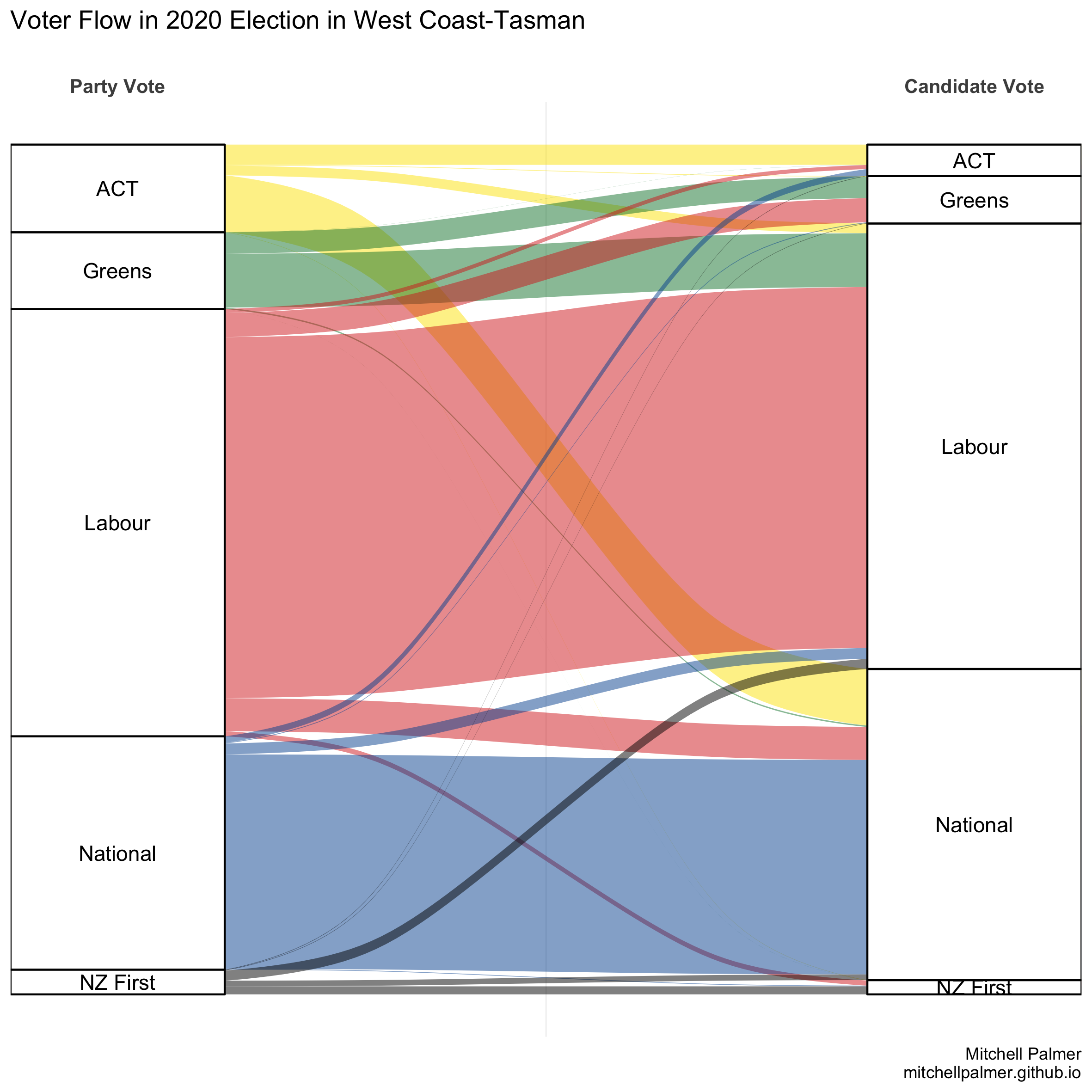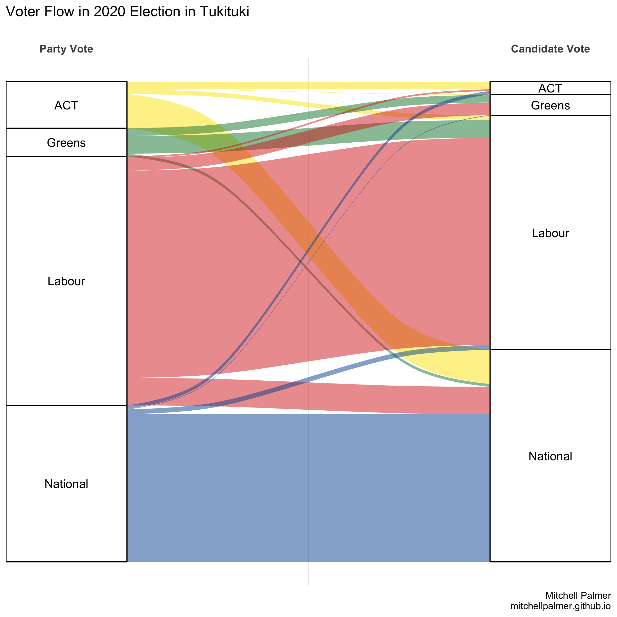 As one might expect, the people who most often split their votes are those who vote for parties which do not actively campaign for the electorate vote in most areas. Interestingly, Labour party-voters split their votes at a much higher rate than National party-voters. Let see where the split-voters from the parties choose to reallocate their votes.