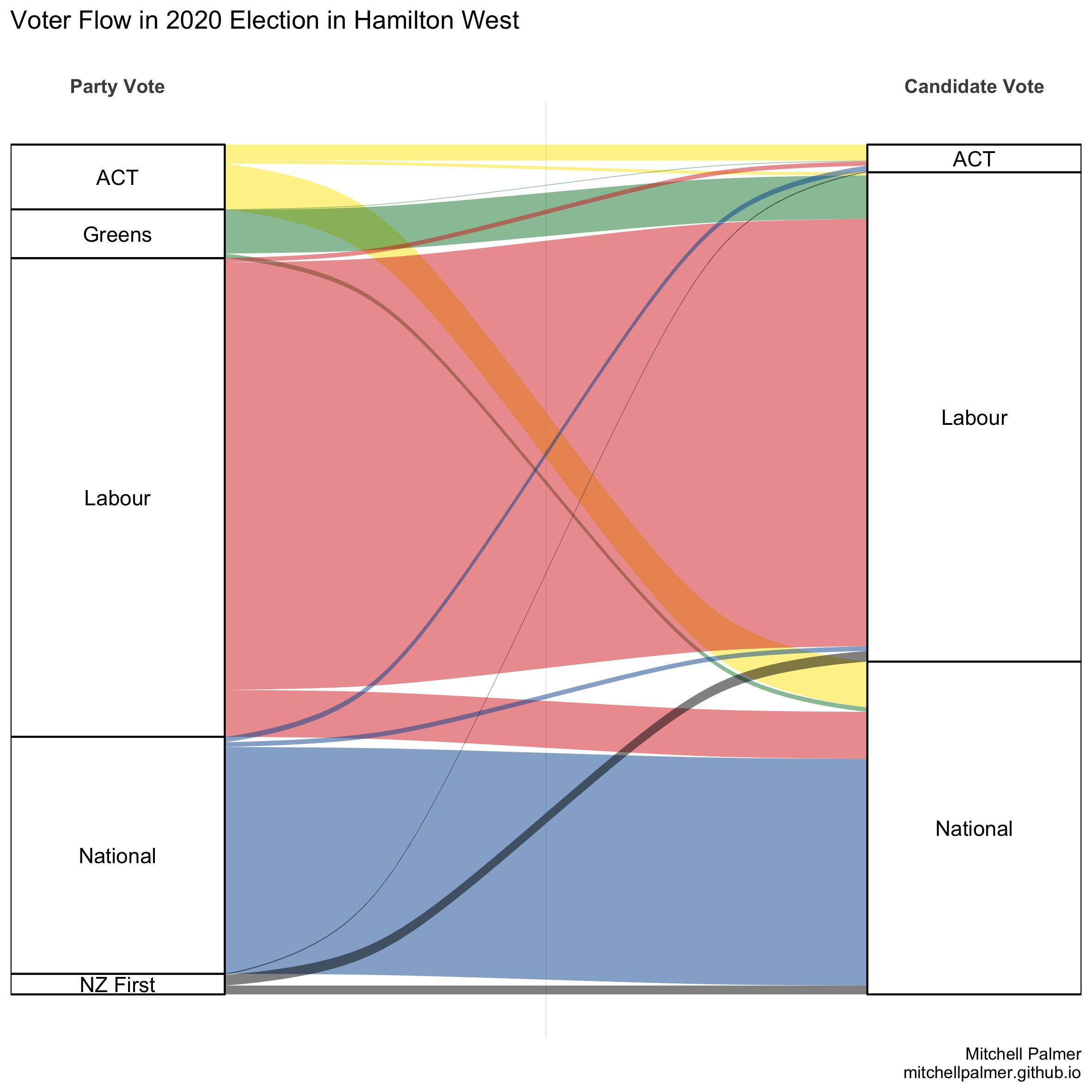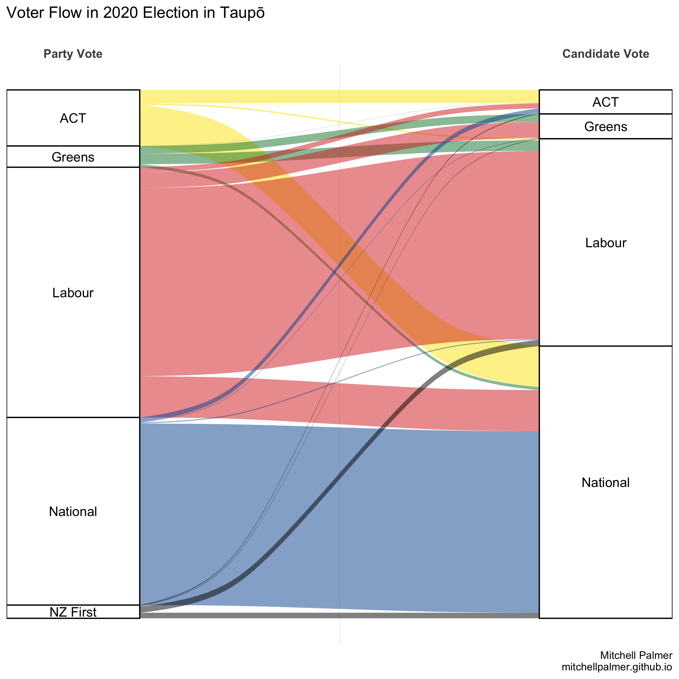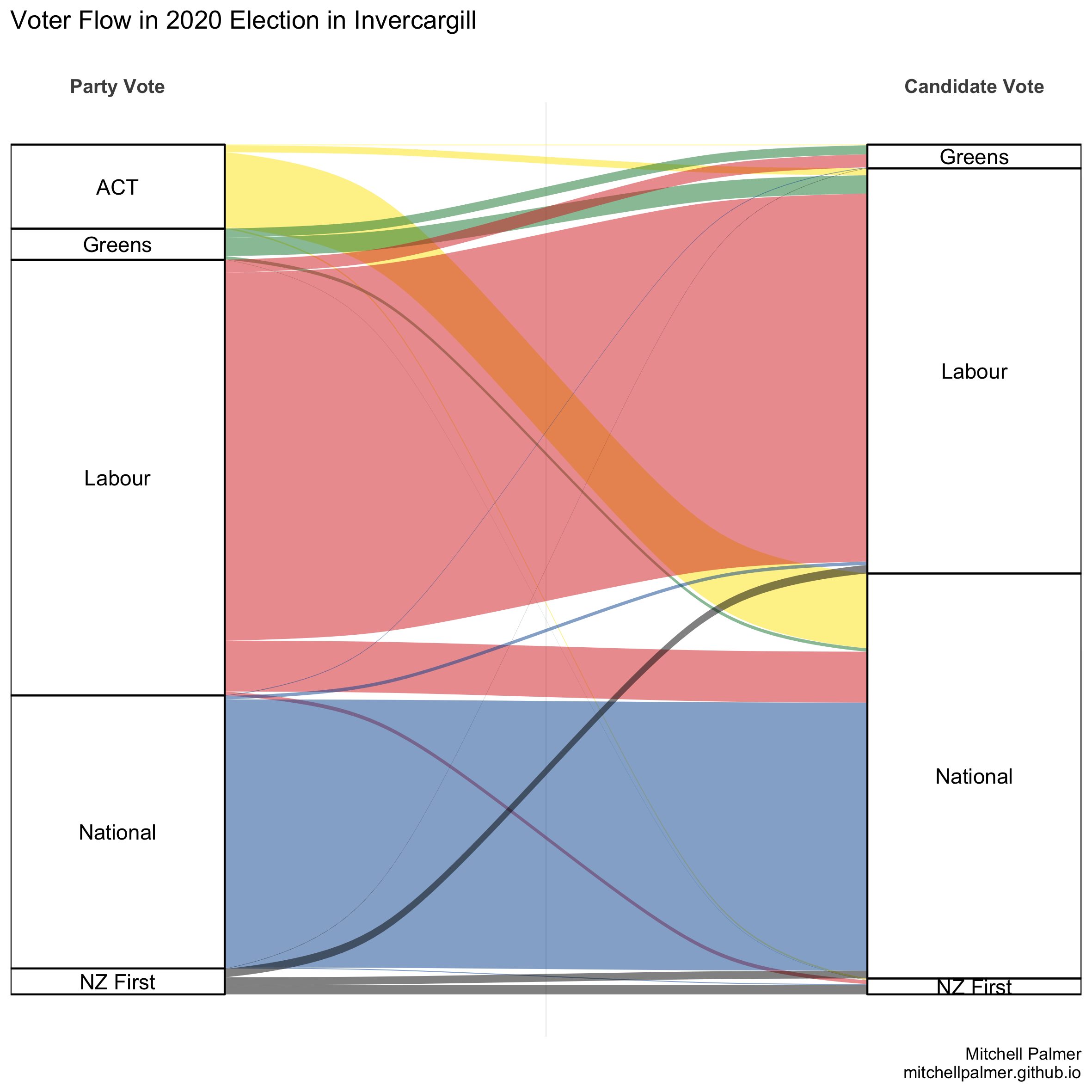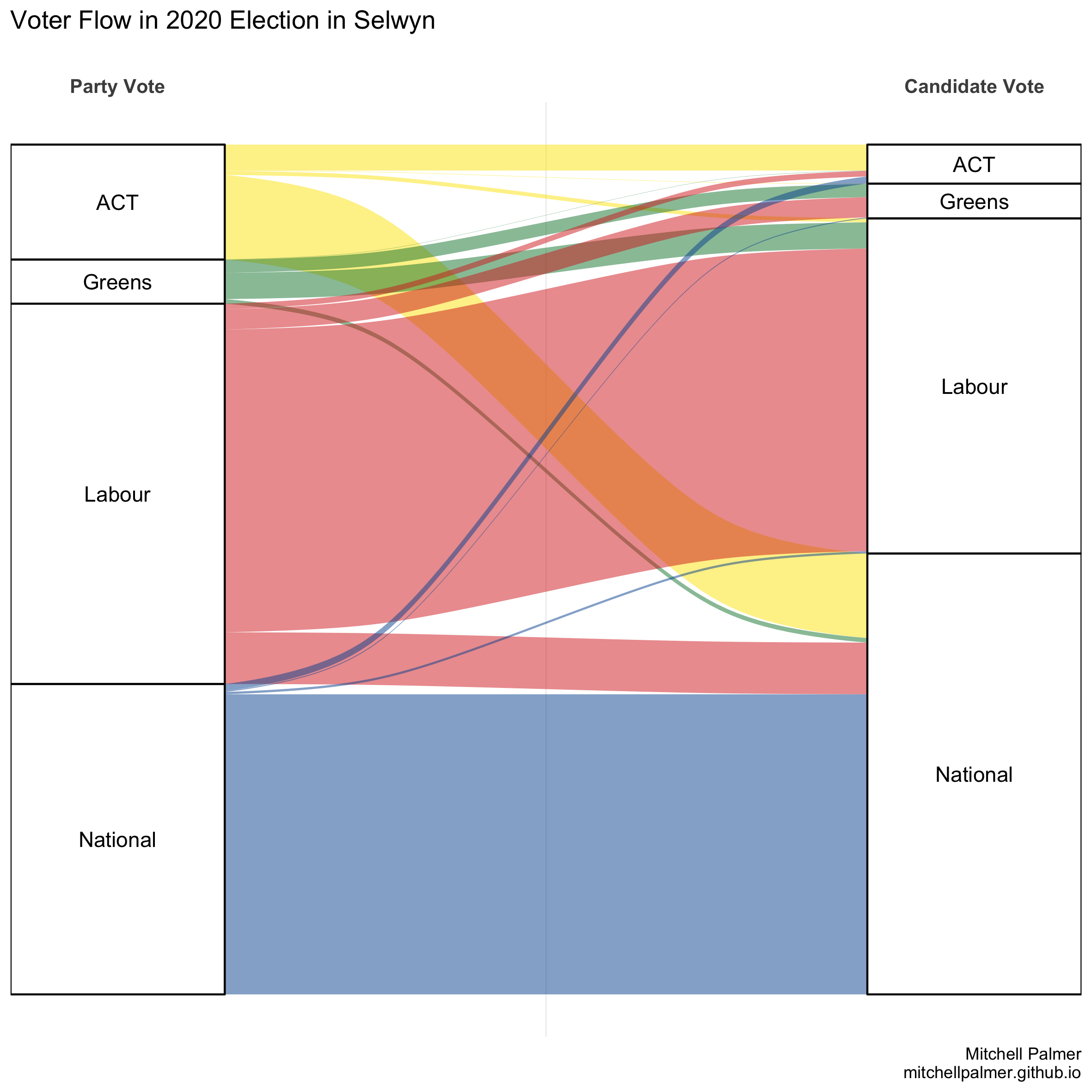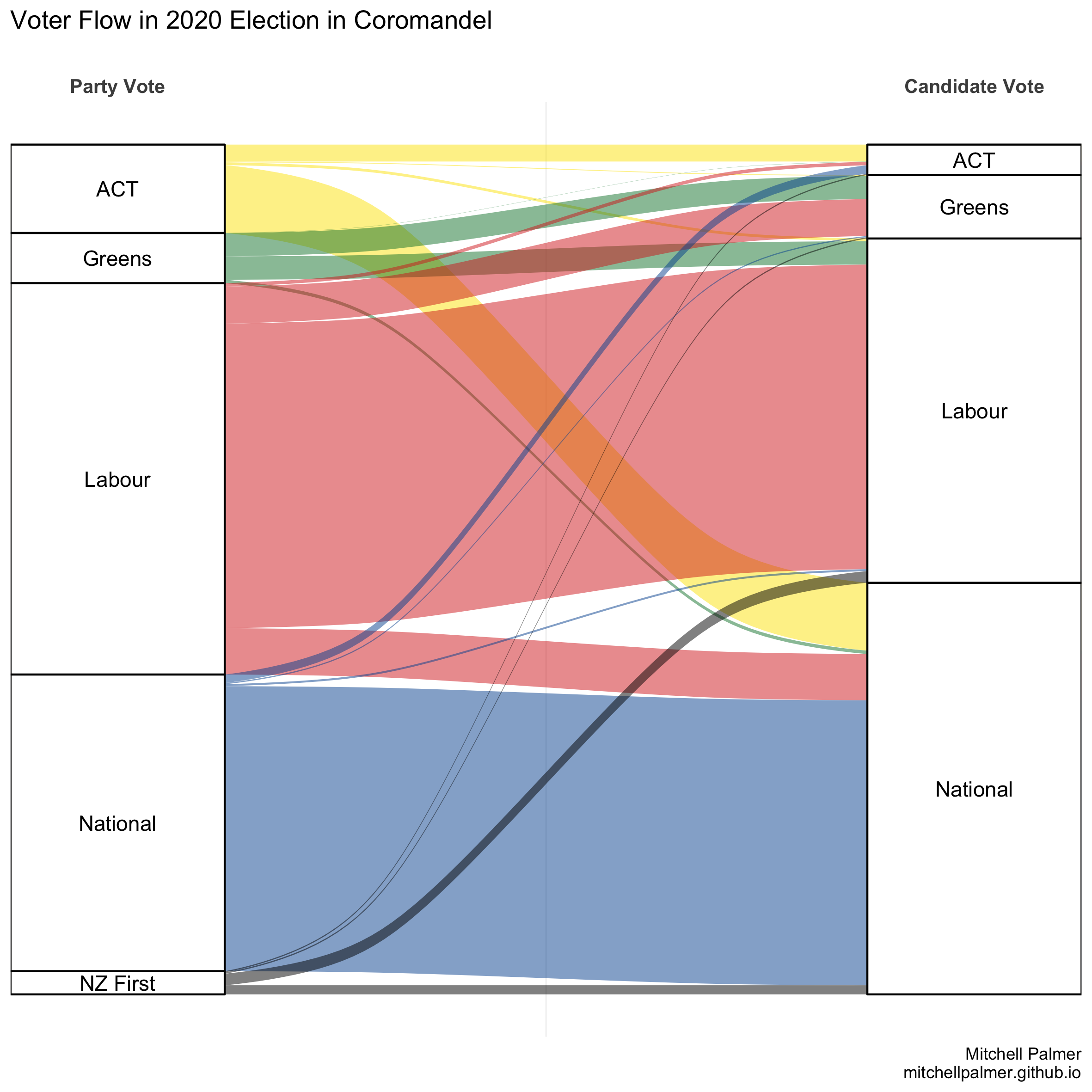 As one might expect, the people who most often split their votes are those who vote for parties which do not actively campaign for the electorate vote in most areas. Interestingly, Labour party-voters split their votes at a much higher rate than National party-voters. Let see where the split-voters from the parties choose to reallocate their votes.