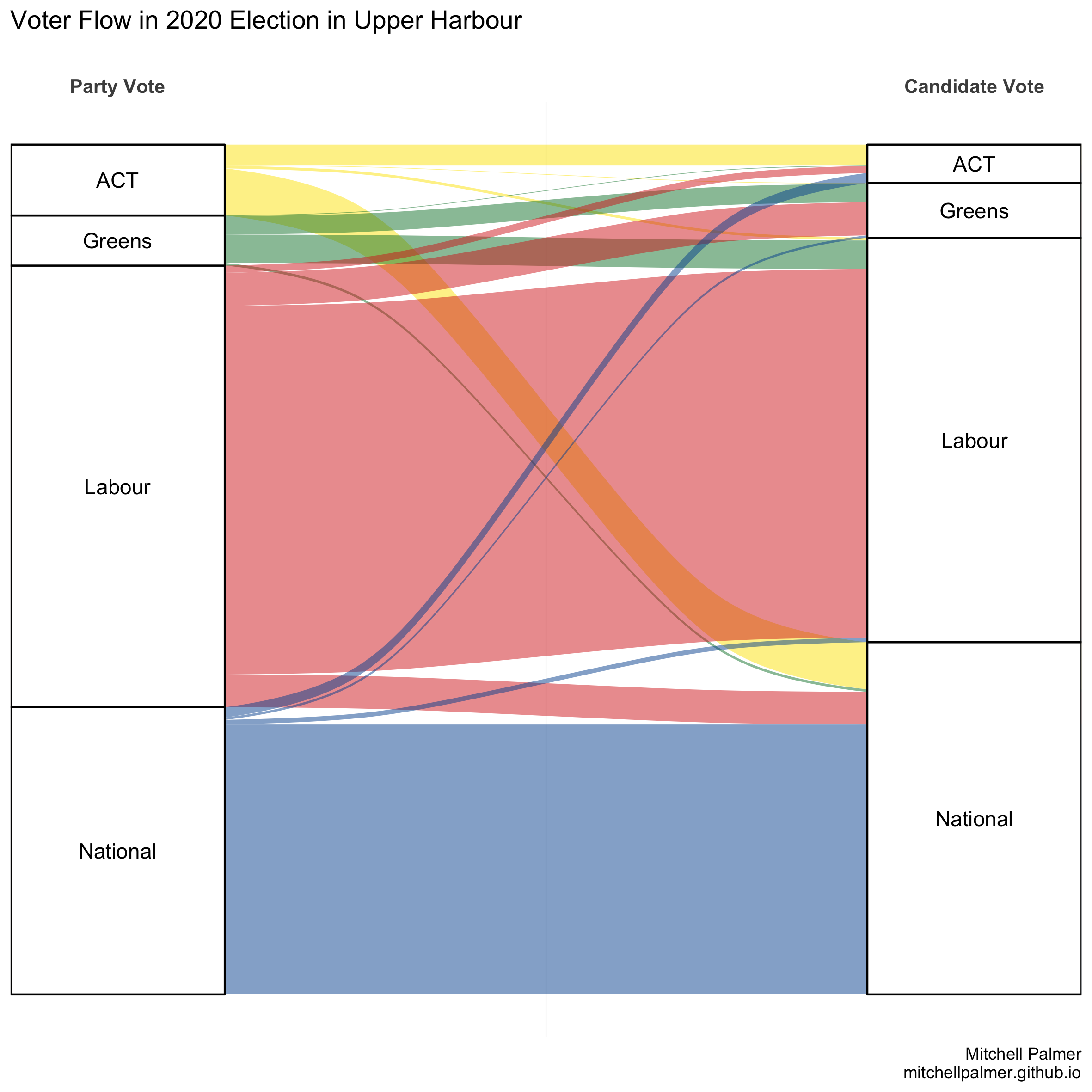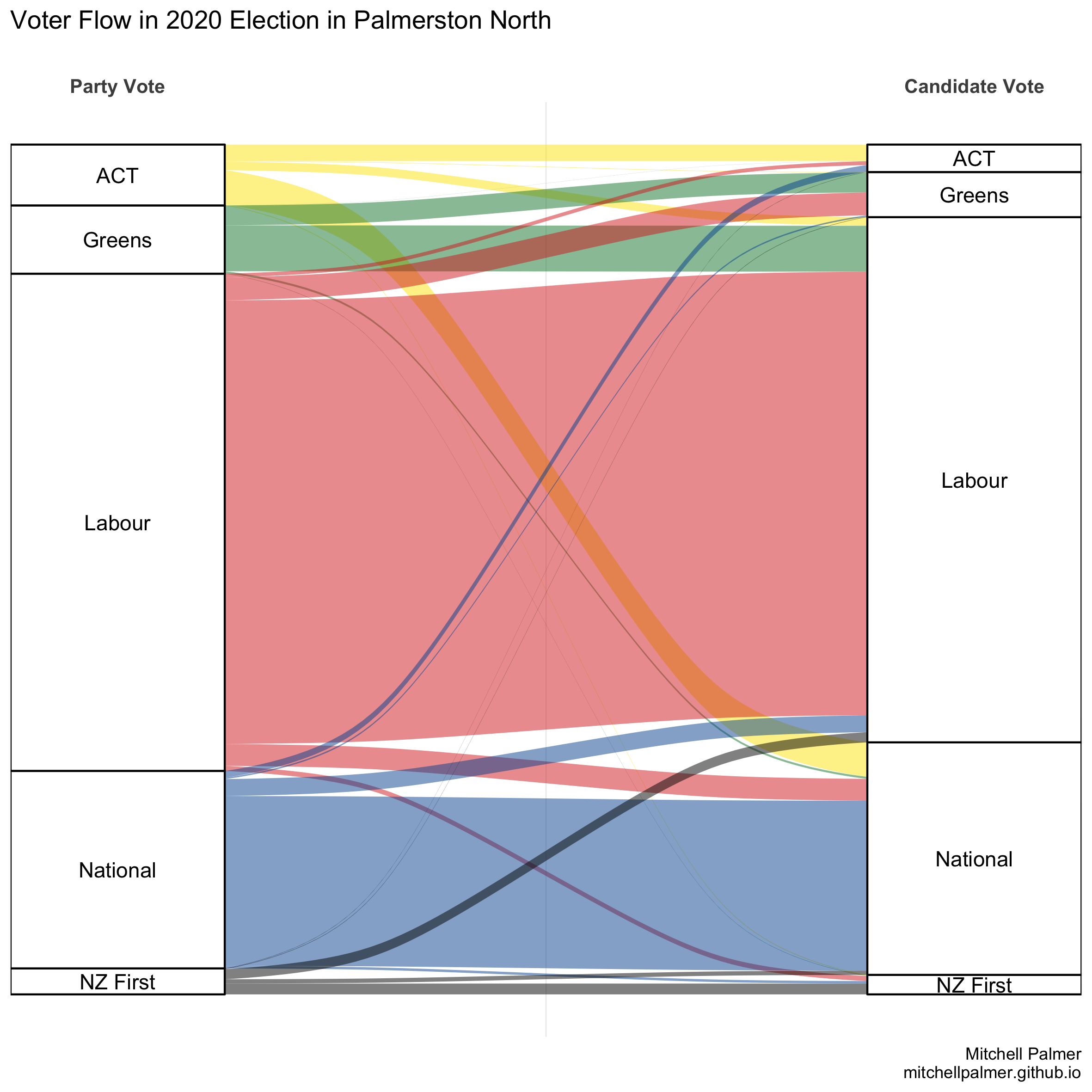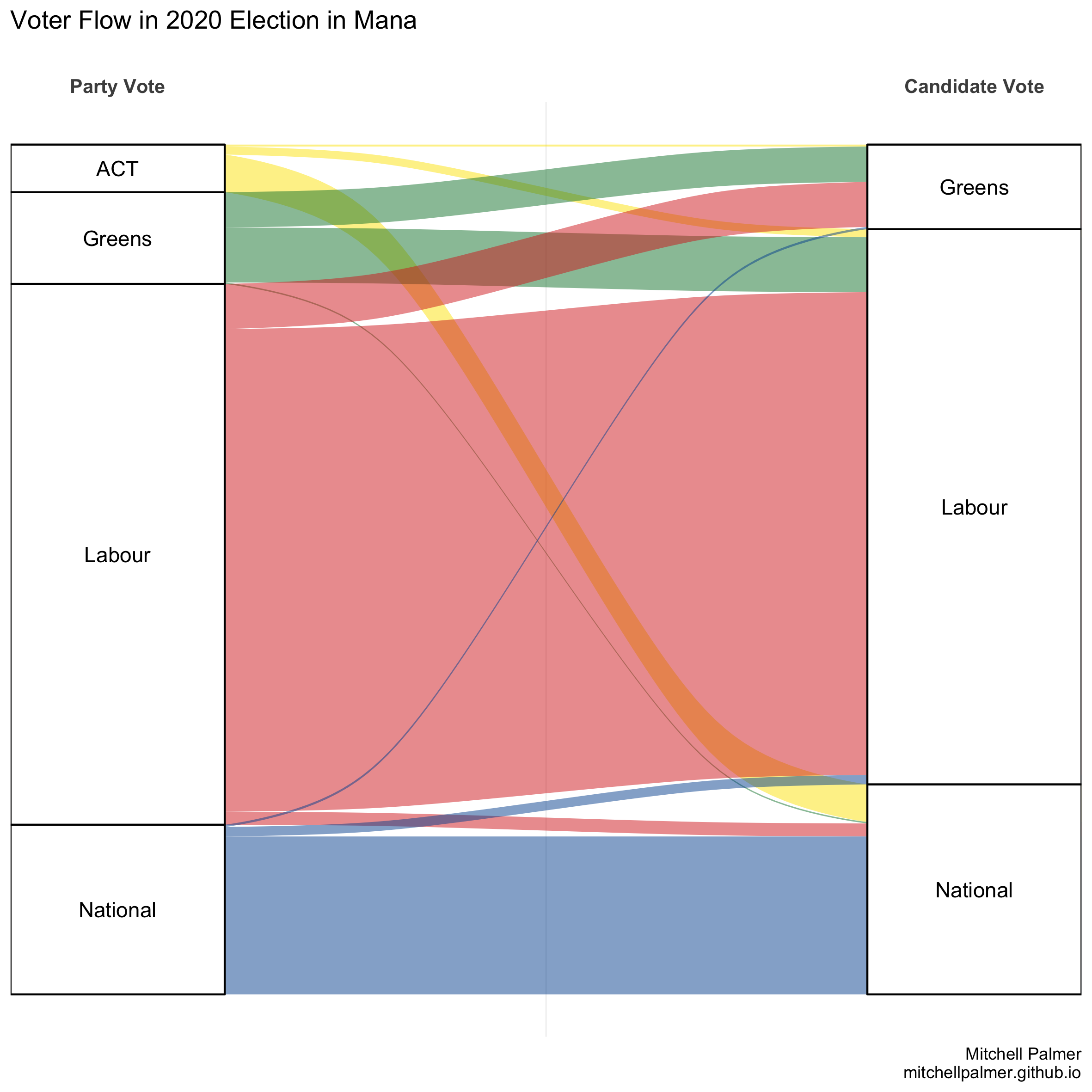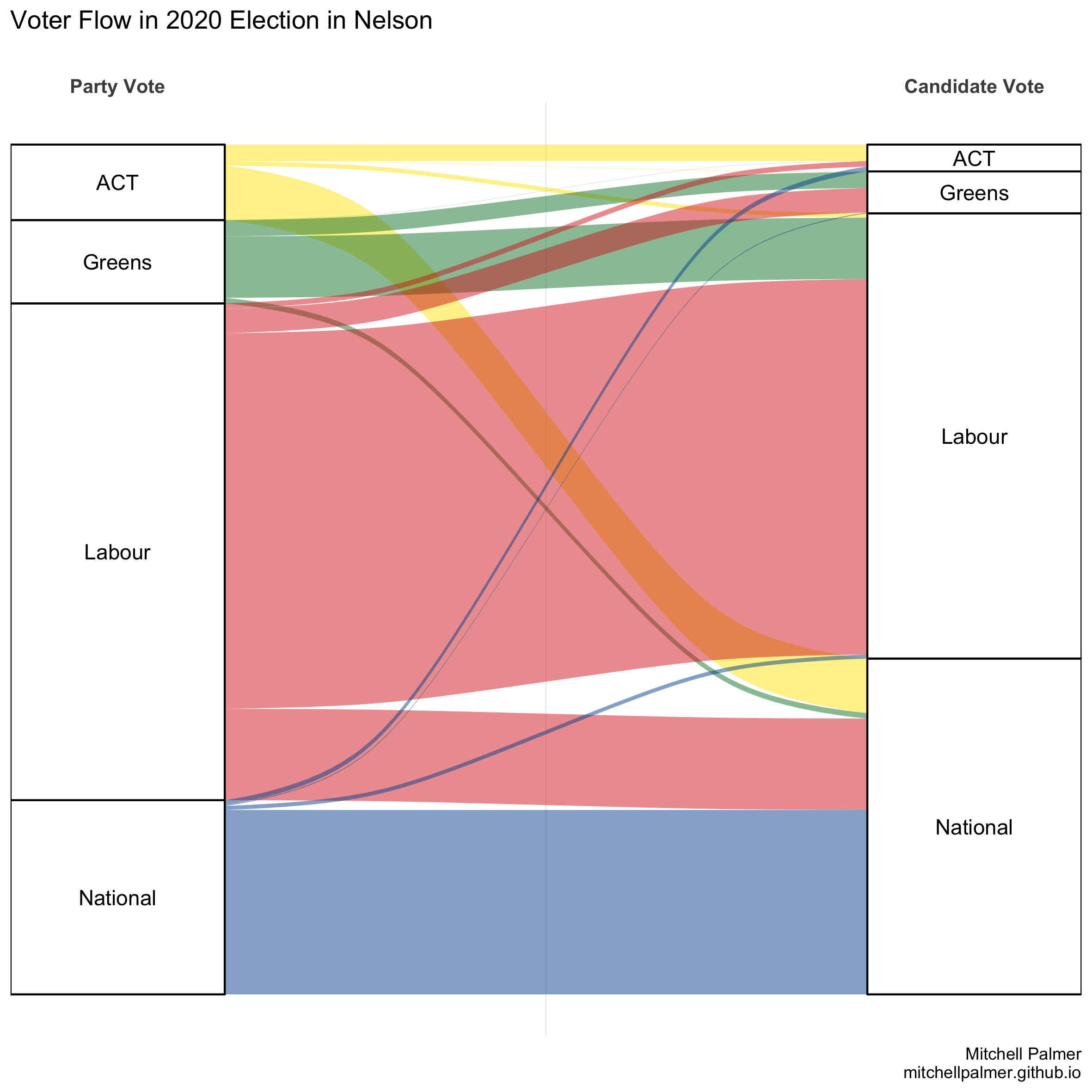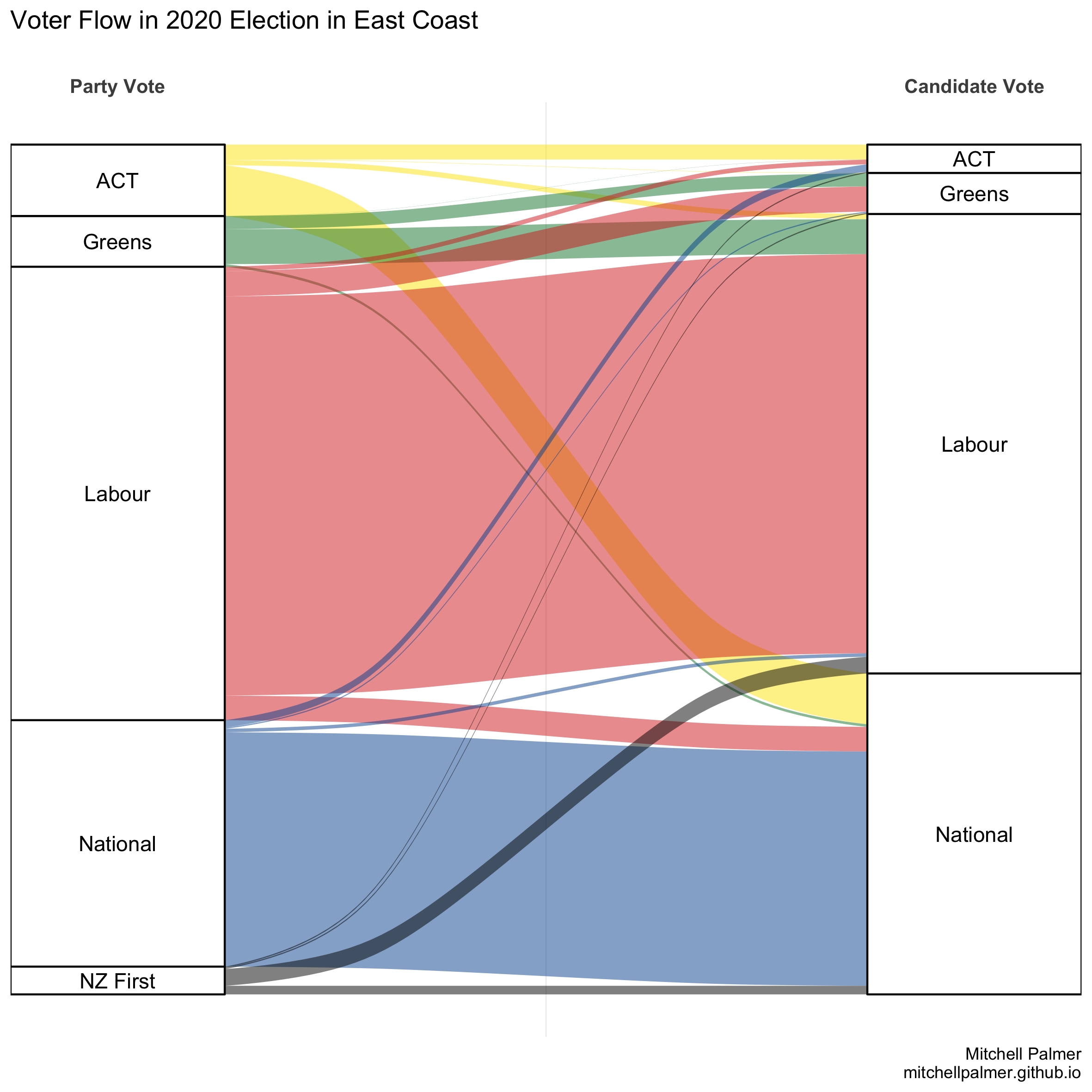 As one might expect, the people who most often split their votes are those who vote for parties which do not actively campaign for the electorate vote in most areas. Interestingly, Labour party-voters split their votes at a much higher rate than National party-voters. Let see where the split-voters from the parties choose to reallocate their votes.