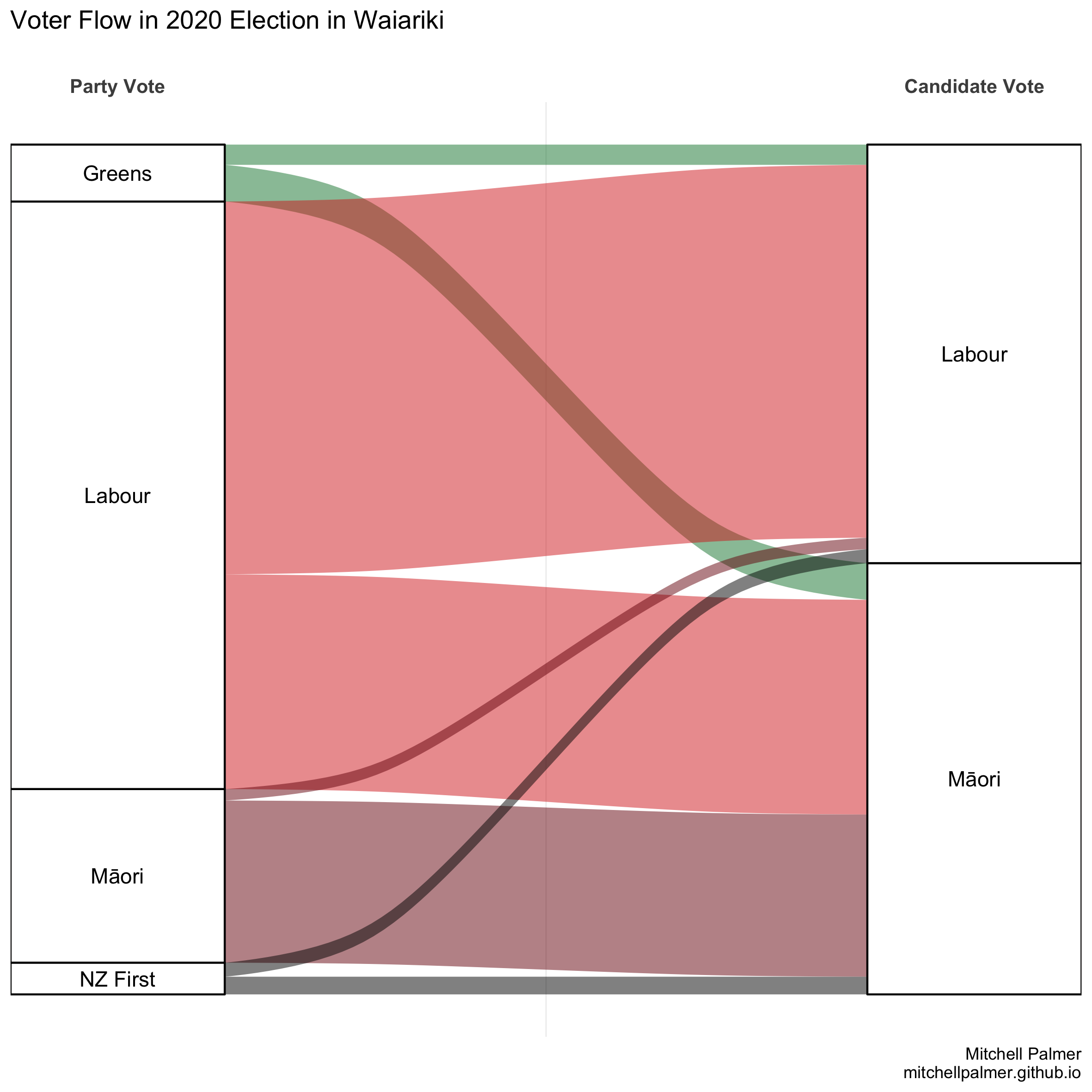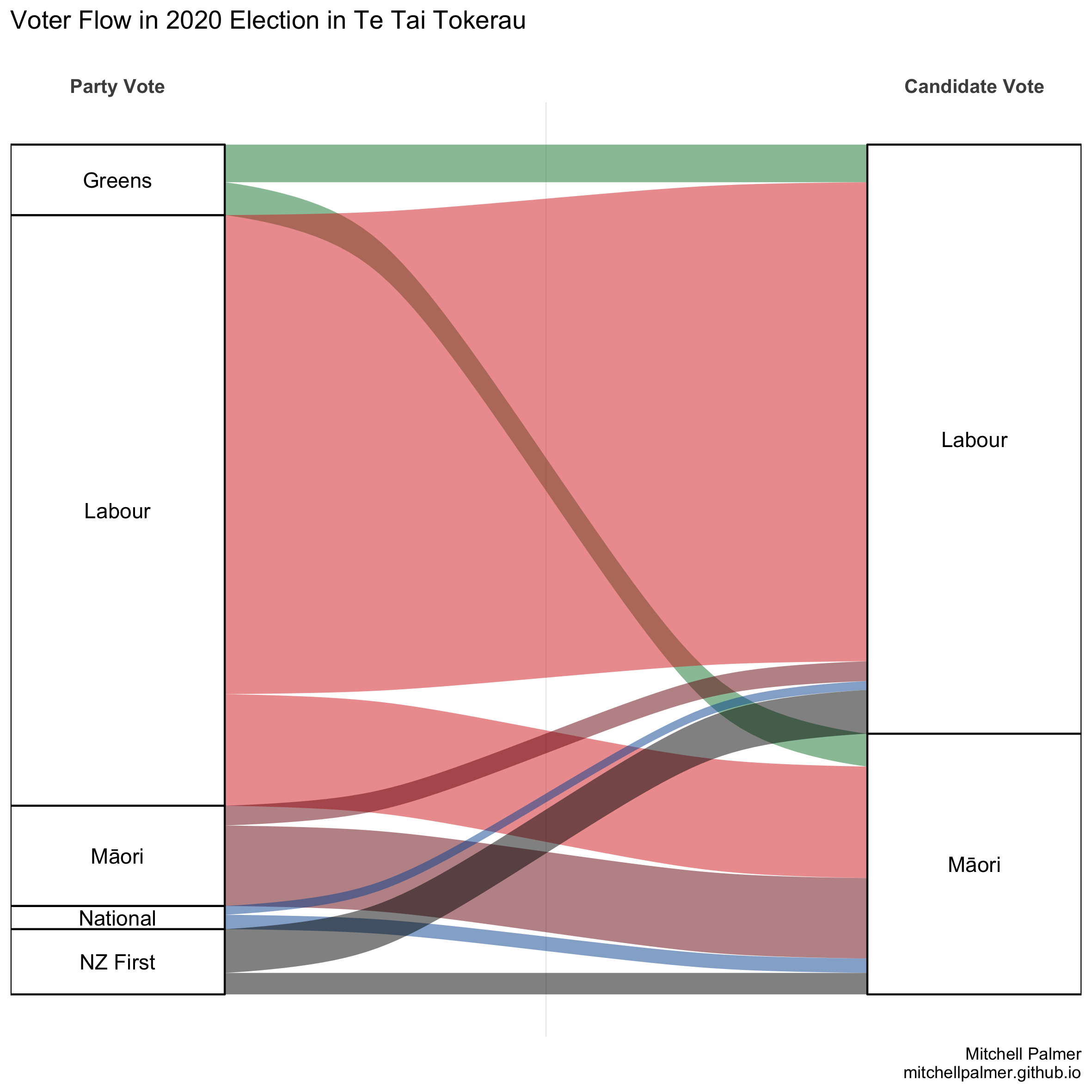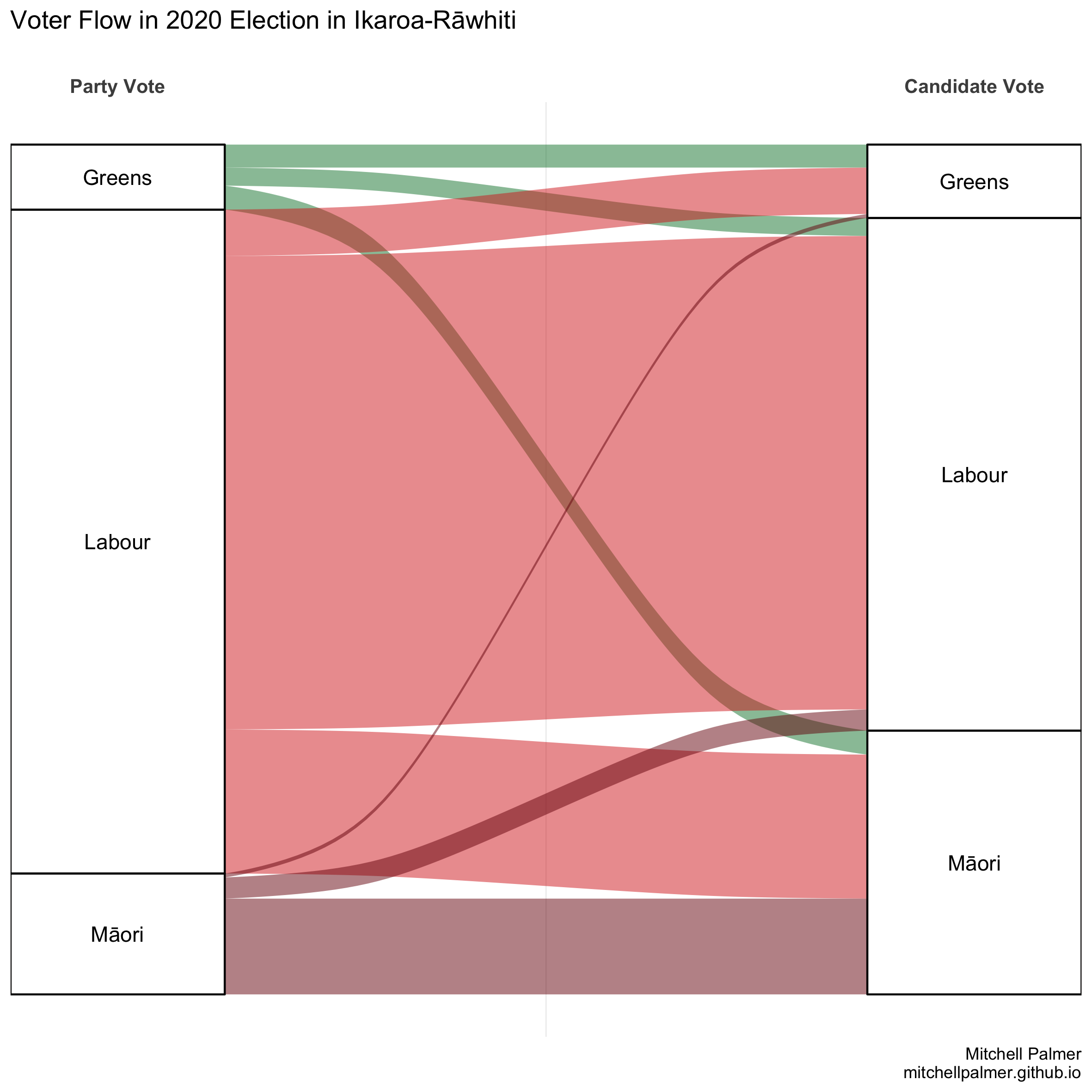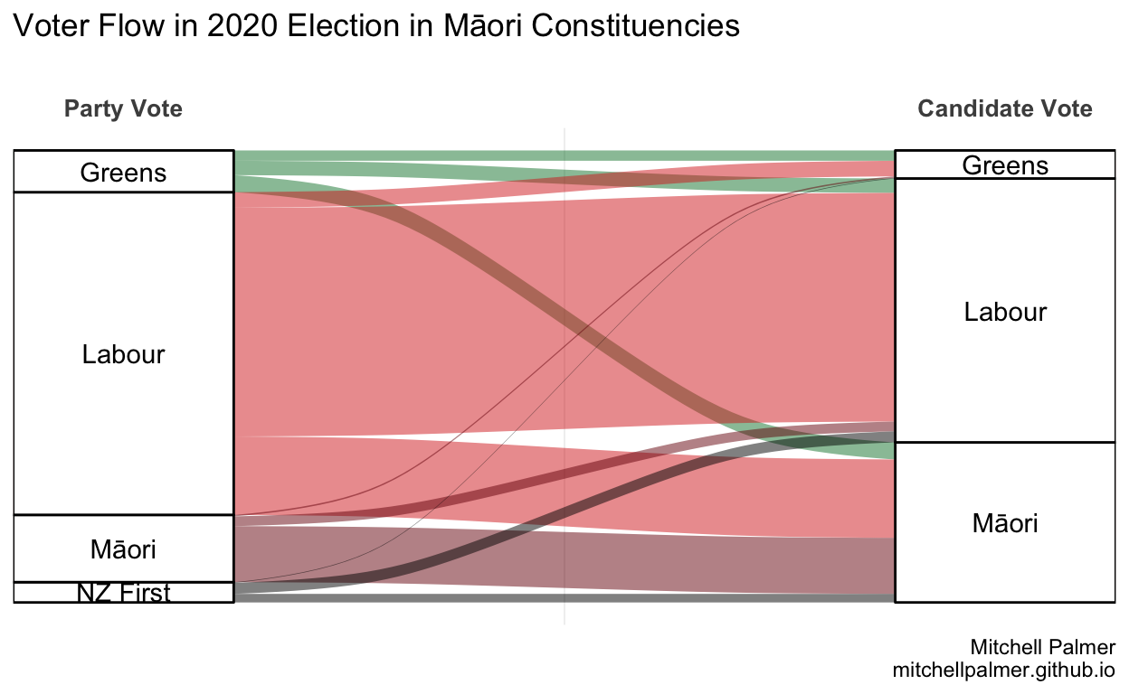 If we restrict ourselves to the Māori constituencies and exclude ACT and National – neither of which are in the top four party-vote recipients in the Māori constituencies – and include the Māori Party and NZ First, this is what the voter flow looks like: