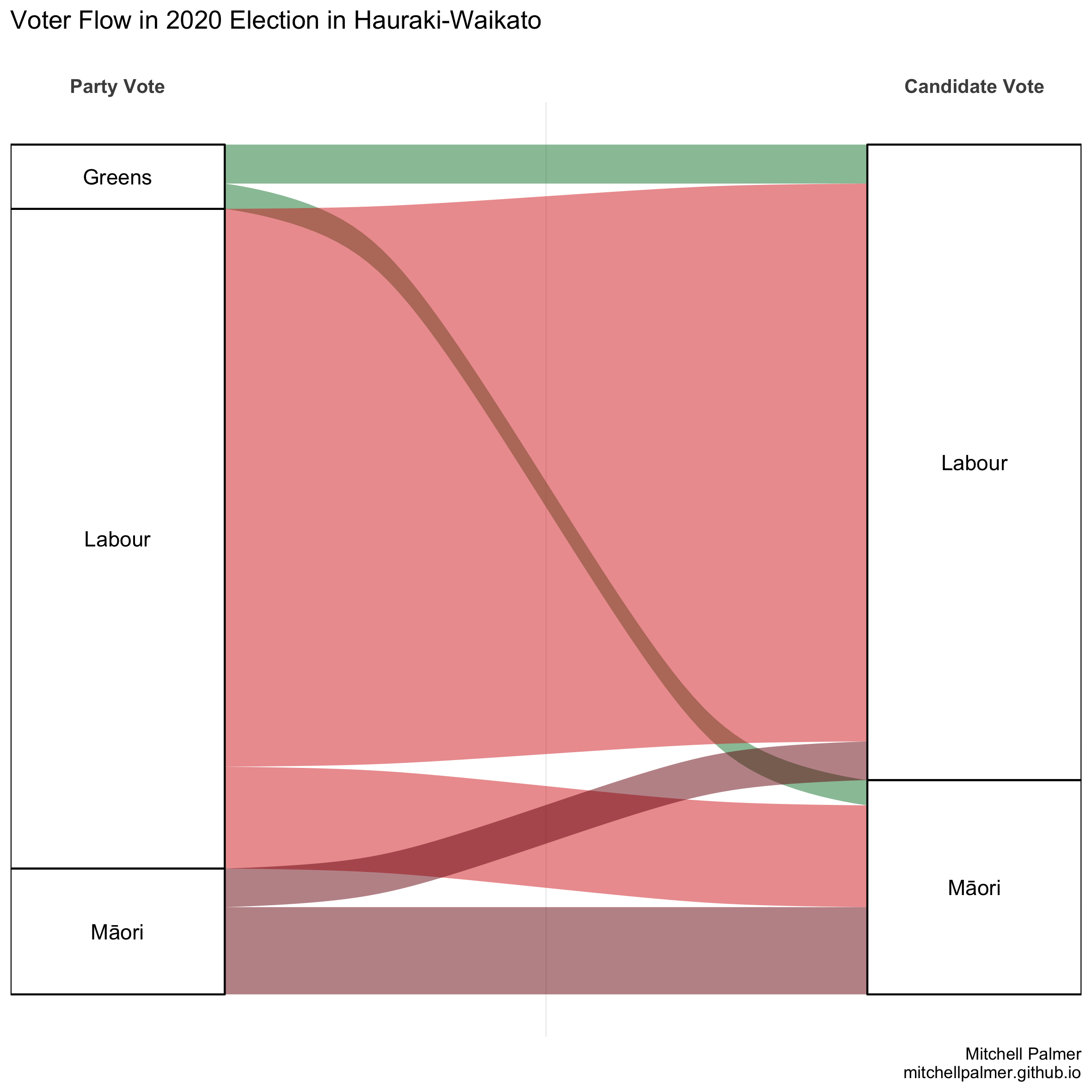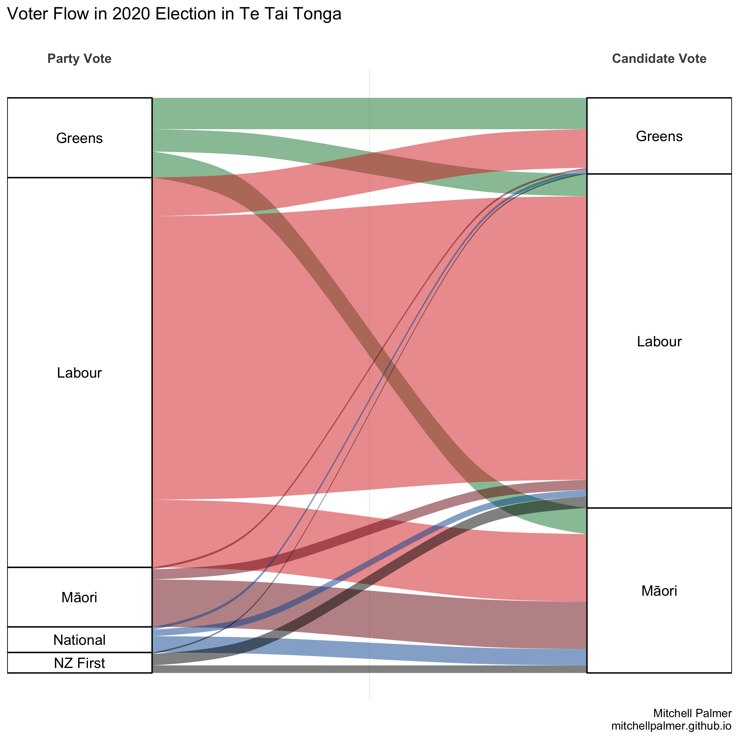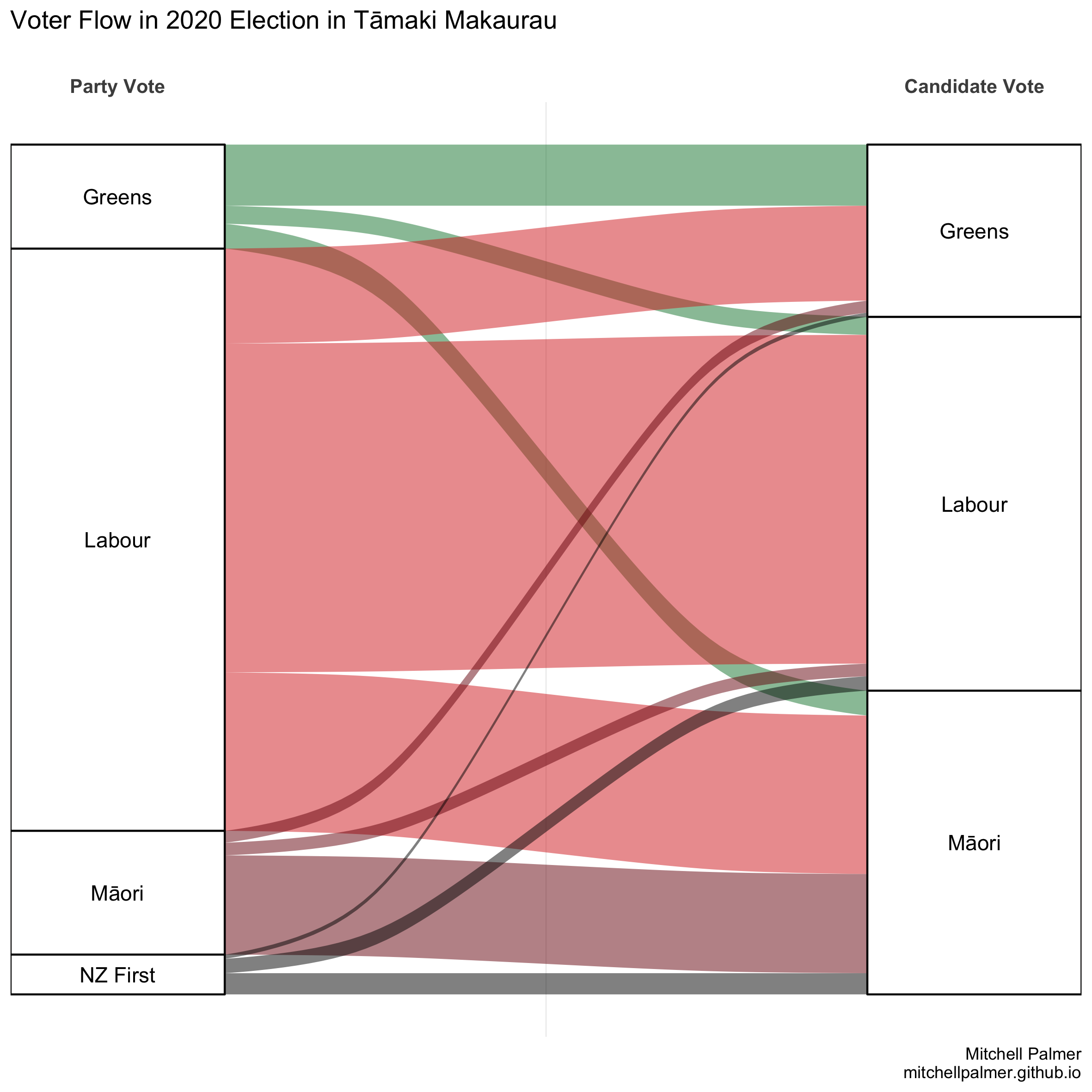 If we restrict ourselves to the Māori constituencies and exclude ACT and National – neither of which are in the top four party-vote recipients in the Māori constituencies – and include the Māori Party and NZ First, this is what the voter flow looks like: