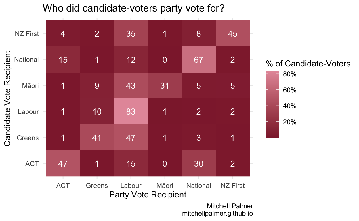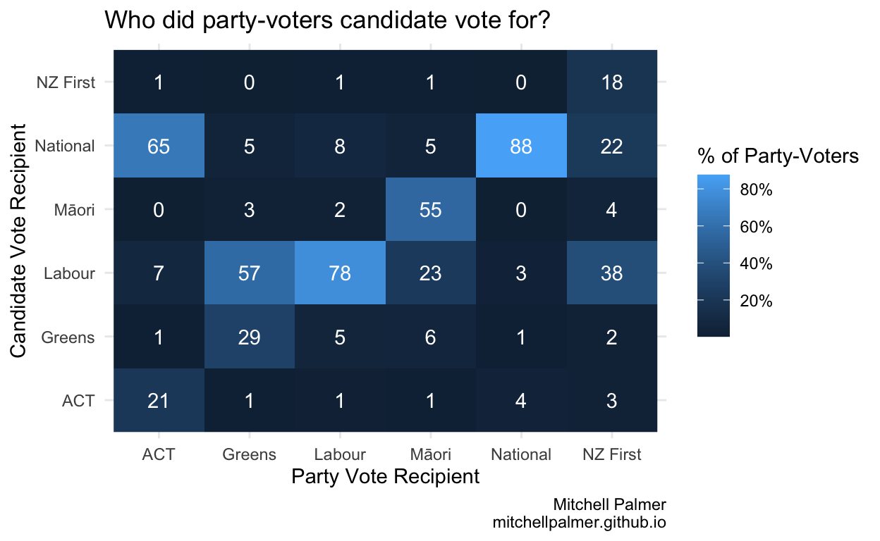 The below graph shows the opposite – i.e., the percentage of people who candidate-voted for one party (still on the y-axis) which party-voted for each other party (still on the x-axis). E.g., the 15% in the (ACT, National) box means that 15% of National candidate-voters party-voted for ACT. The National row sums to 97%, meaning that 97% of National candidate-voters cast their party votes for one of the six displayed parties.