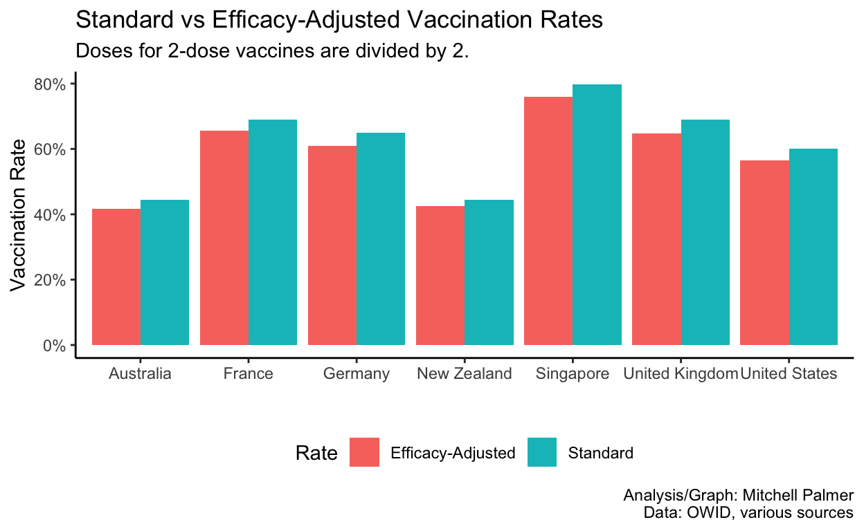 As such, this brief blog post limits itself to a much simpler, more tractable model. First, we consider \(n\) different vaccines administered in a country (\(c\)) with a population (\(p_c\)), each with an effectiveness against hospitalization (\(e_i\)), a recommended number of doses for a full course (i.e., 2 for Pfizer and 1 for J&J) (\(f_i\)), and a number of doses of the vaccine given (\(d_i\)). With those figures, we can create an ‘efficacy-weighted vaccination rate’ (\(r_c\)). This weighting accounts for the obvious fact that lower efficacy vaccines need higher coverage to reach equivalent protection.