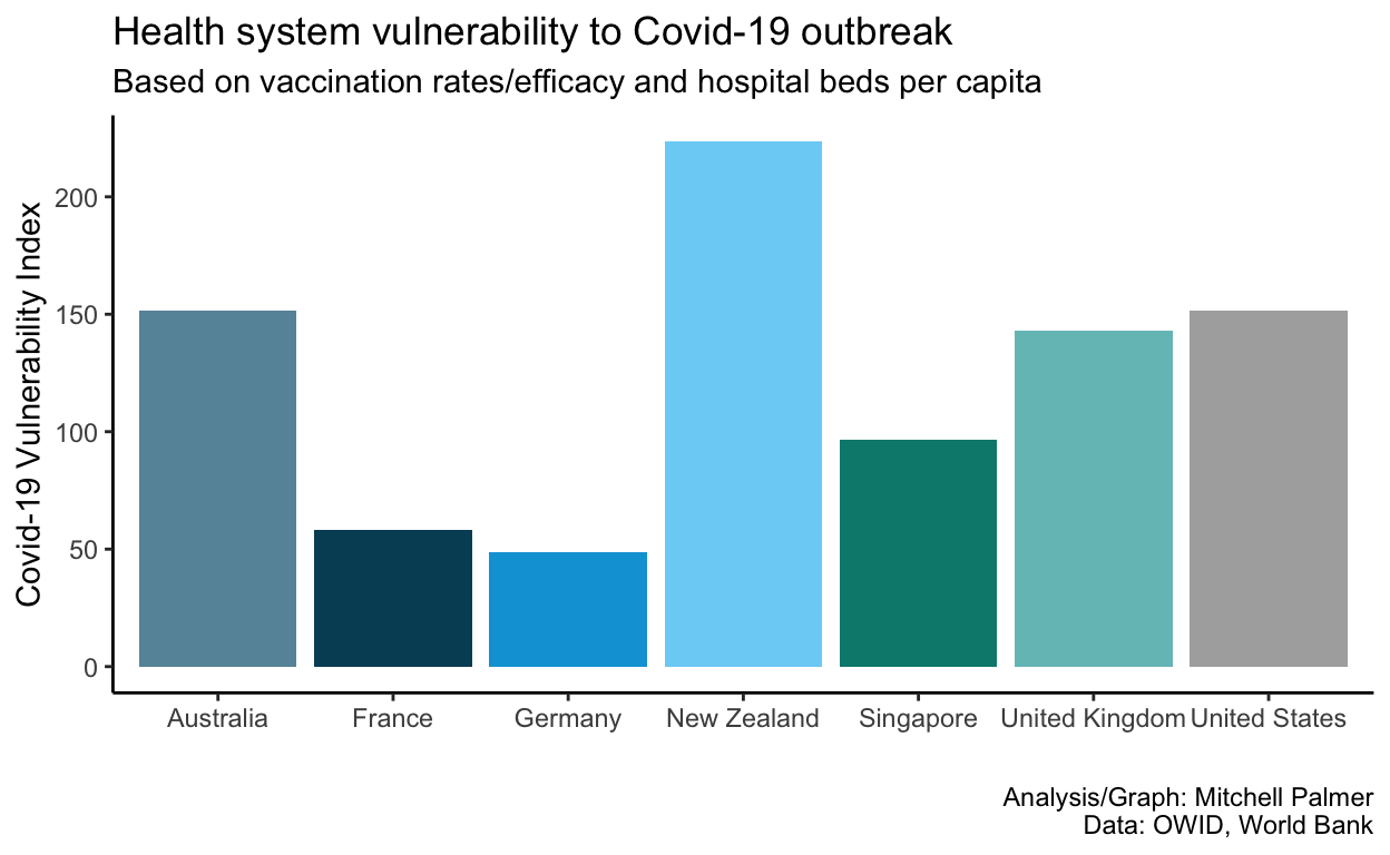 Now, there are a variety of limitations to this data (notably that World Bank beds-per-capita data can be up to 10 years old [it isn’t for most countries in this dataset though] and is based on capacity, not spare capacity at any given moment), but the broad conclusion should be deeply worrying for my New Zealand compatriots: With our current level of vaccination and the current capacity of our health care system, New Zealand would be the most vulnerable rich country for which data is avaliable were the Delta variant to enter the community. On my crude metric, we would be roughly 50% more vulnerable than Australia. This seemingly validates the Prime Minister’s decision to move very quickly into lockdown given the most recent outbreak – and offers some explanation for why NSW took longer to do so. Moreover, it emphasises why it is so important for New Zealand’s vaccination programme to succeed, despite its incredibly slovenly start.