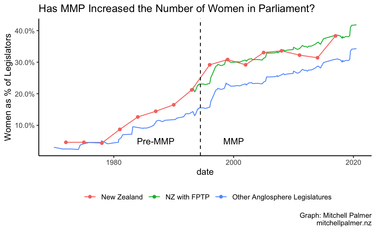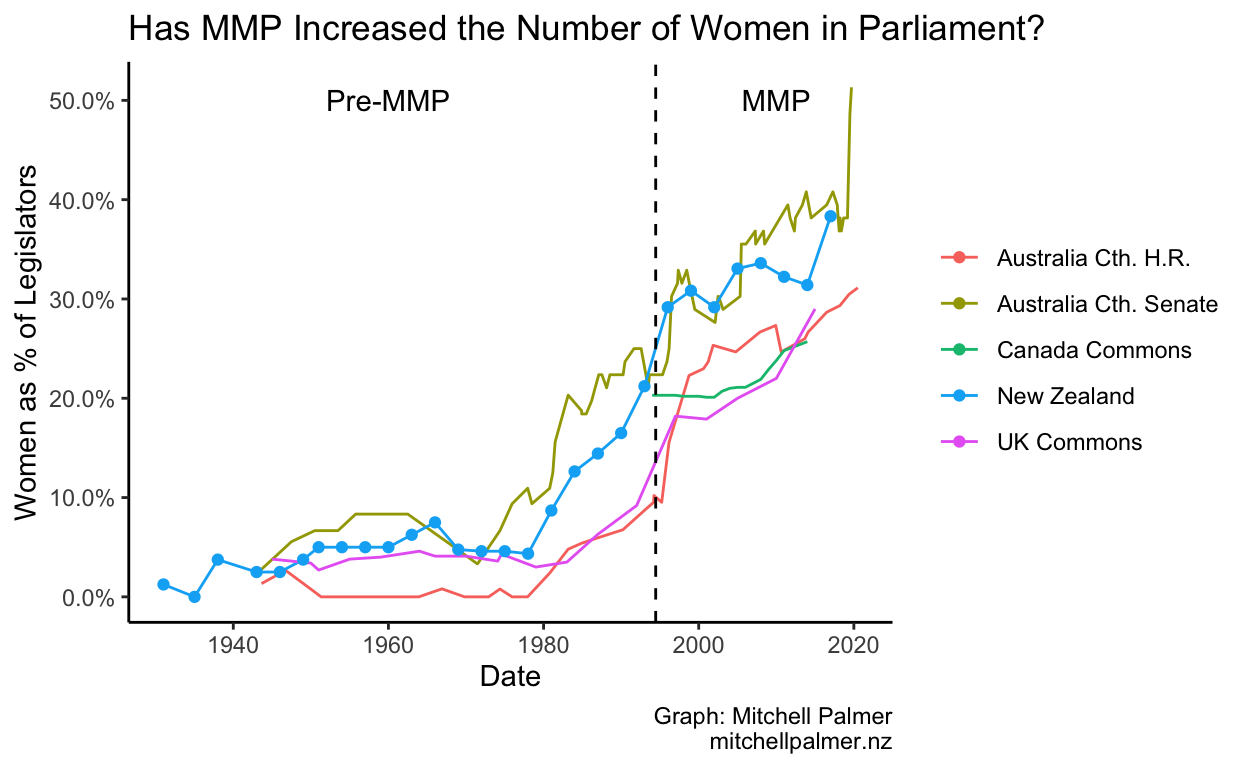 However, one claim from the last article in the series raised my hackles. Henry says, “MMP has definitely delivered more diversity to Parliament. Women won just 10 per cent of the seats in the last nine elections under FPP. They have won 34 per cent in the first nine MMP elections.” Although not explicitly stated, the clear implication we are meant to draw is that MMP caused this increase in diversity and, in particular, the increased representation of women.